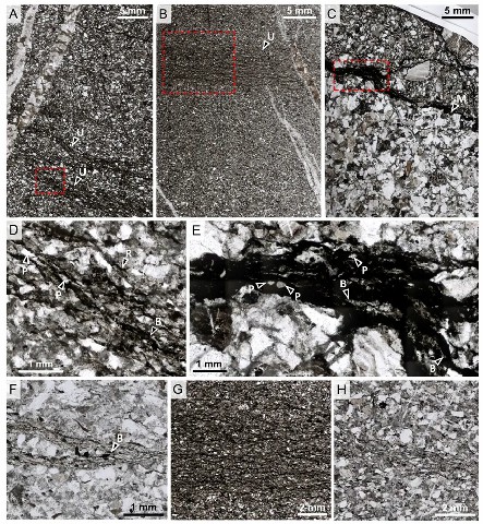 图1 Mosquito Creek组微生物席的岩石学特征:显示富含碳质物质的微生物席位于分选差、粗细不一的长石砂岩中。微生物席微结构注释如下:U = 波状纹层;M = 微生物席覆盖在沉积层之上;P = 夹杂的颗粒;B = 微生物纹层的分叉与网状结构;R = 上卷。A中的红框表示D;B中的红框表示G;C中的红框表示E。