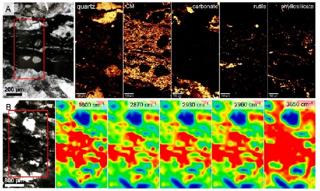 图2 Mosquito Creek组微生物席的显微光谱特征。A 二维拉曼相图,分别为石英(465 cm-1)、碳质物质(1600 cm-1)、碳酸盐矿物(1090 cm-1)、金红石(610 cm-1)和层状硅酸盐矿物(3620 cm-1)。B 傅里叶变换红外光谱(FTIR),分别为芳香碳(C=C; 1600 cm-1)、脂肪族碳(CH2和CH3; 2870、2930、2960 cm-1)和层状硅酸盐矿物(3650 cm-1)。