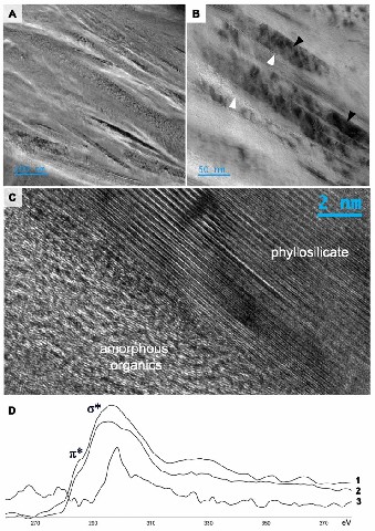 图3 Mosquito Creek组微生物席的高分辨率透射电镜(HRTEM)和电子能量损失谱(EELS)特征。A-C HRTEM图像显示碳质物质(白色箭头指示)在伊利石(黑色箭头指示)之间保存。D EELS光谱(1-2,碳质物质;3,层状硅酸盐矿物)。