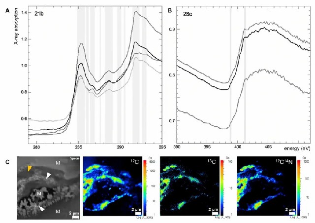 图4 Mosquito Creek组微生物席扫描透射X射线显微术(STXM)(A-B)和纳米离子探针(NanoSIMS)(C)特征。
