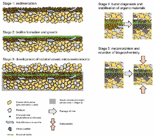 太古宙(4.0–2.5 Ga)为地球早期生命起源与演化的关键时期,其沉积记录为揭示早期生物圈的特征及地球环境的演变提供了至关重要的证据。前寒武纪生物地球化学信号常在低能和较封闭的环境下保存,如页岩等细粒沉积岩沉积环境下。相对而言,形成于高能水动力环境下的粗粒碎屑岩(如砂岩),由于受高能沉积环境的影响,有机质容易遭受氧化分解或被碎屑物质破坏,不利于其长期保存。然而,上述理论难以解释如下情况。在全球范围内多处太古宙克拉通区域,例如南非的巴伯顿绿岩带和澳大利亚的皮尔巴拉克拉通,发育的硅质碎屑岩中均能观察到微生物席及微生物诱导的沉积构造(MISS),这一发现表明这类岩石可能拥有特殊的不同于细粒沉积岩的碳质物质保存机制。