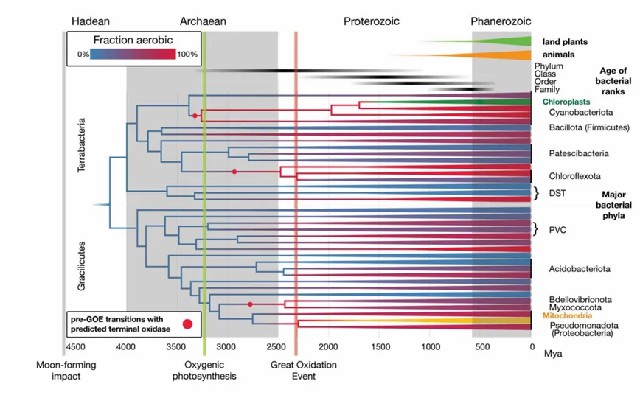 图1 细菌演化时间标定与氧适应历史重建的综合研究。该研究通过整合基因组数据、化石记录和地球化学证据,并将细菌的氧耐受性和好氧代谢与大氧化事件相关联,推断了细菌的演化时间树。图中蓝色表示厌氧状态,红色表示好氧状态,紫色深浅则表示现存细菌门类中好氧谱系的比例。研究还纳入了线粒体和质体数据,以利用更丰富的真核生物化石进行校准。此外,图中标注了陆生植物和动物的出现时间,以便进行时间对比。