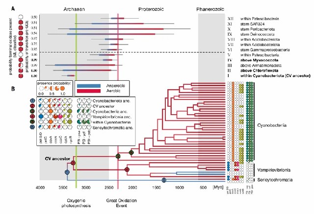值得注意的是,虽然以大氧化事件作为时间校准点,但仍检测到至少3次转变早于该地质事件,这一发现表明,好氧呼吸作用可能在大气氧含量明显上升之前就已出现,并可能对蓝细菌产氧光合作用的进化产生了促进作用。