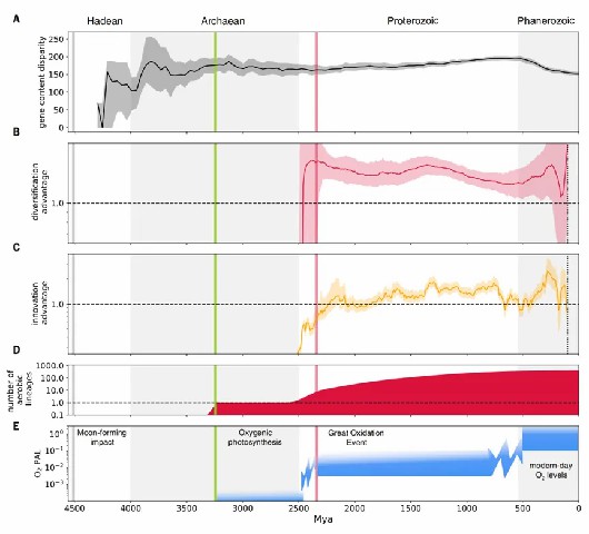 综上,最早的好氧细菌在太古宙就已出现,比大氧化事件提前约9亿年,其中蓝细菌祖先的好氧代谢演化尤其关键,这一早期适应可能直接促进了产氧光合作用的发展(图2)。大多数细菌门类的祖先均为厌氧菌,其向好氧生活方式的转变主要发生在大氧化事件之后。分化时序显示,现存细菌门类的多样化始于太古宙至元古宙,而科级分化则普遍完成于显生宙之前(图3)。特别明显的是,大氧化事件后好氧菌谱系的辐射速率显著超越厌氧菌谱系,充分证明大气氧含量升高是驱动细菌演化的关键环境因子。