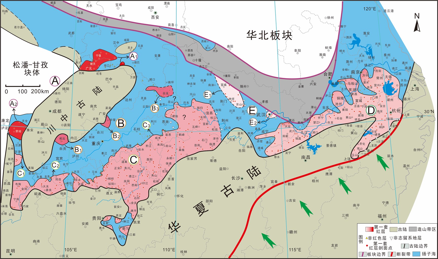 图2 华南志留系第一套海相红层的时空分布态势与华夏古陆隆升方向(绿色箭头)的关联