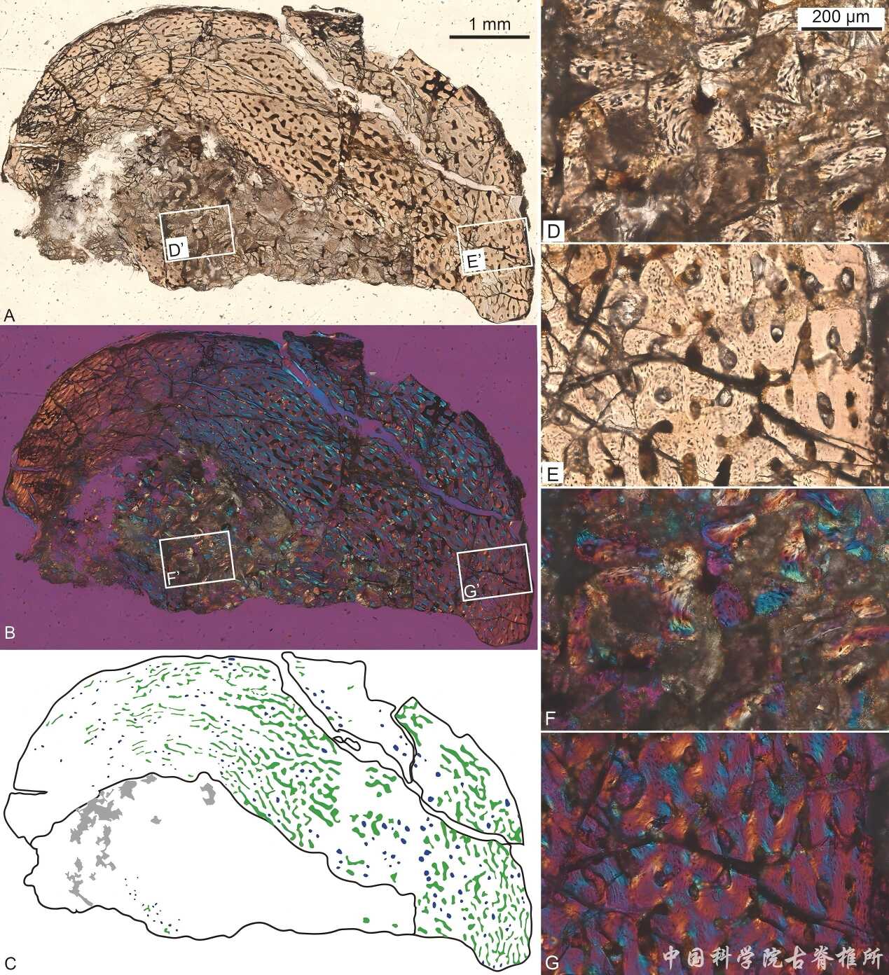 为解决这一争议,研究团队选取了两件不同体型的奇异辽宁龙标本进行研究:一件是股骨长度31.5毫米的ELDM V1121标本,体型与正型标本(股骨长28.5毫米)接近;另一件是股骨长度56.5毫米的IVPP V 20798标本,是目前已知个体最大的奇异辽宁龙个体。科研人员对它们的肋骨、肢骨、颈半环甲板等不同骨骼进行了切片分析,结果发现所有骨骼切片均缺乏生长停滞线、外周休止系统(external fundamental system)和次级骨单位,说明两个个体在死亡时增均不到一岁。