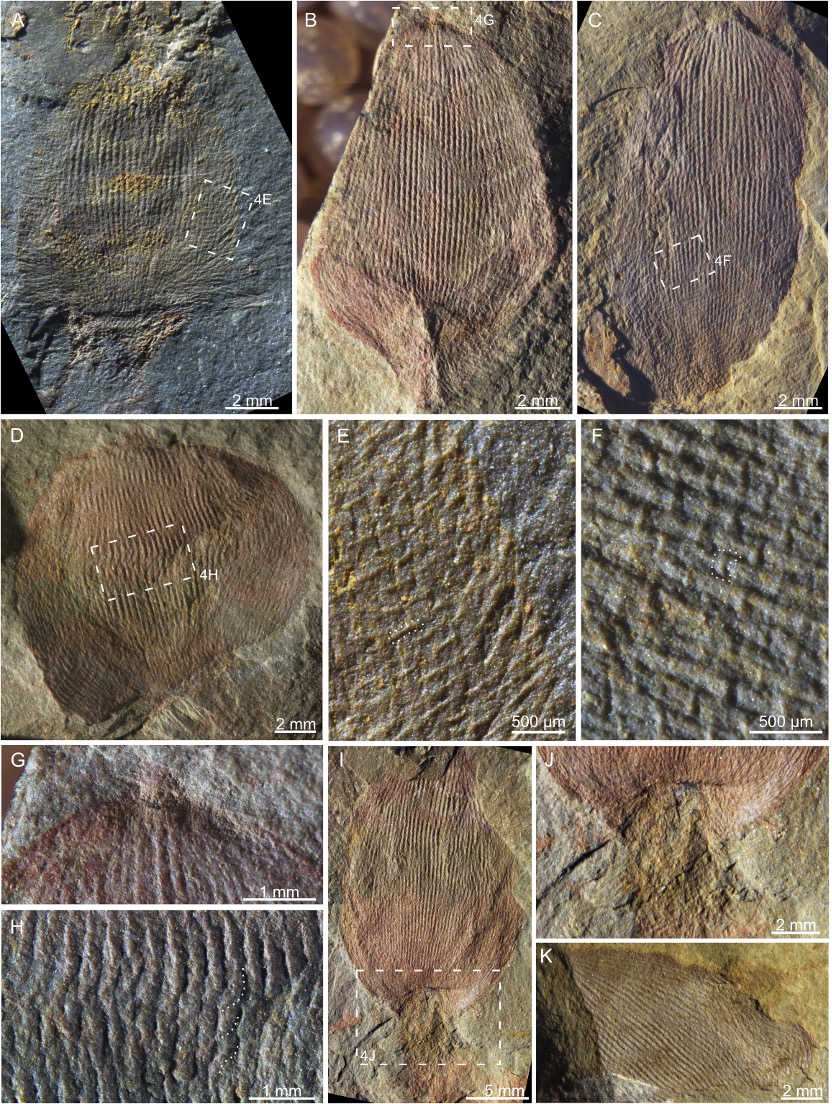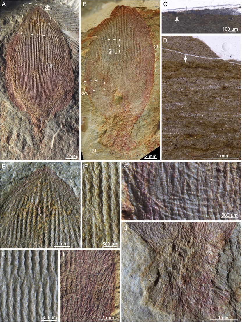 图1 旋柱莲苞海绵的正模标本(A,E,F)、一个副模标本(B,G,H–J)及另一块化石标本及其围岩的岩石薄片(C,D)。