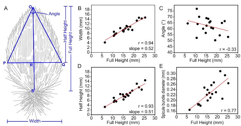 由此可见,5.1亿年前的旋柱莲苞海绵已经发展出了许多与现生海绵相似的适应策略。然而,研究中发现,这类海绵无论个体大小,一律保持严格相似的莲苞状形态,似乎不具有现生海绵中常见的形态可塑性以及模块化的水沟系结构。寒武纪其他细丝海绵类化石由于较少保存完整形态而尚无系统的形态测量研究,但在一百多年的研究历史中,也经验性地被认为具有较规则的形态。