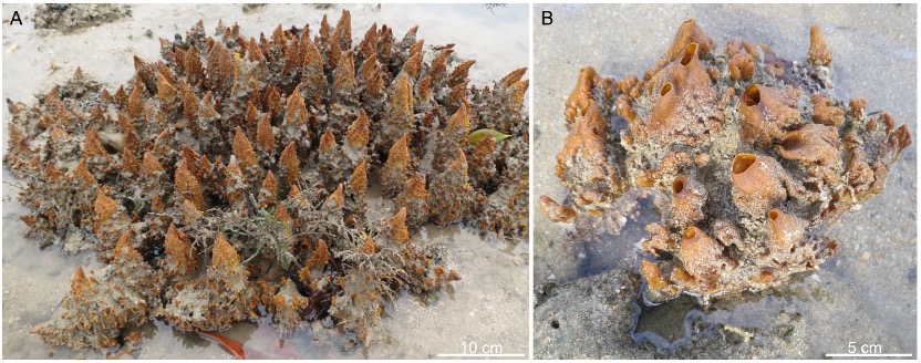 图4 新加坡的砂栖性普通海绵Spheciospongia sp.。(A)和(B)分别示其出水口关闭与打开时的状态。