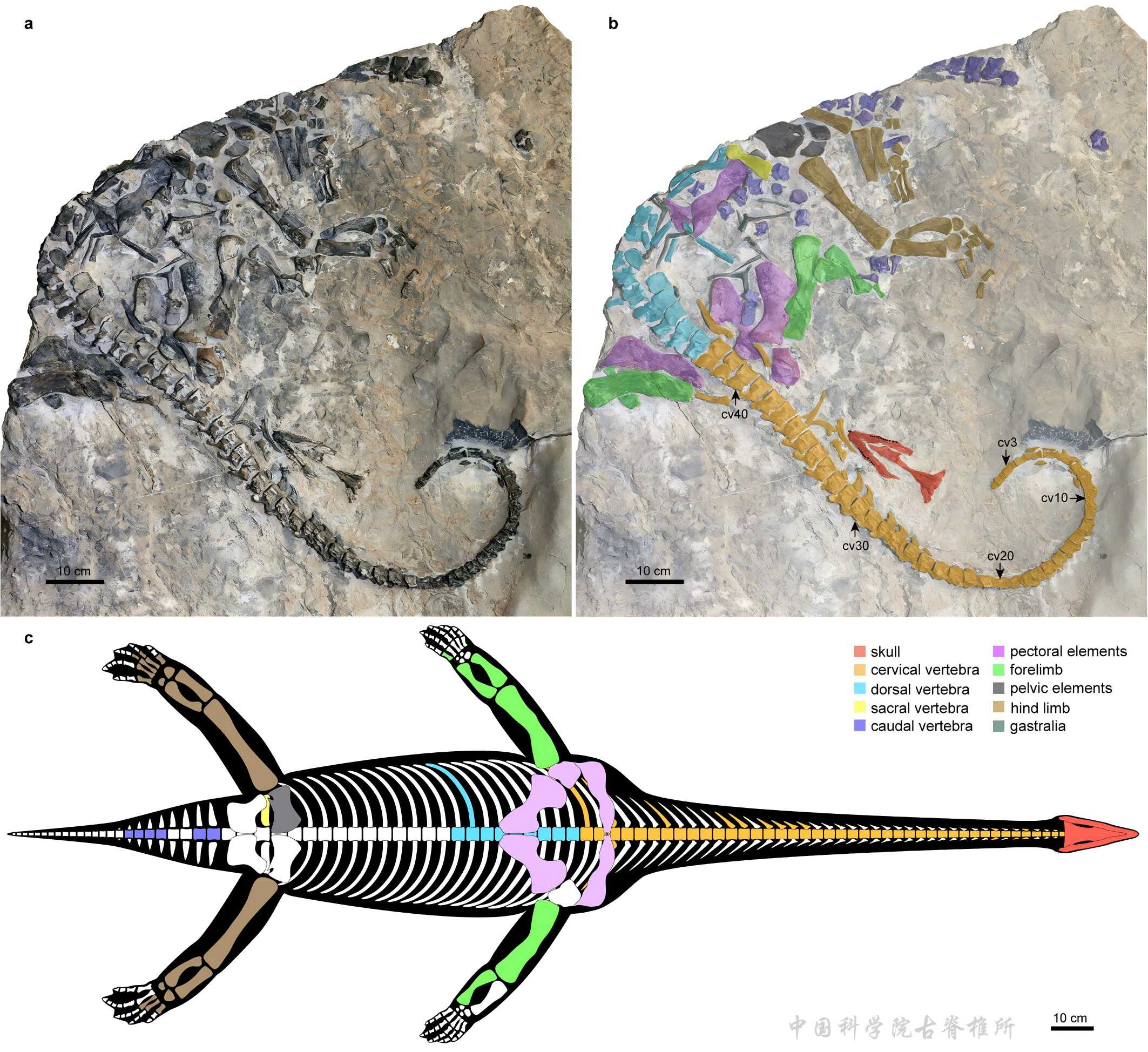 化石保存在一块巨大的石灰岩表面,经过古脊椎所技术人员的修理,暴露出一具体长超过2.5米的鳍龙类骨架。根据缺乏翼间窗、颌关节与枕髁平齐、咽鼓管孔位等头骨特征,以及肩带和肱骨的形态,研究者确定其属于幻龙类(Nothosauria)。基于目前包含三叠纪鳍龙类最完善的形态矩阵,研究者开展了系统发育分析,其结果进一步确定了永胜丽江龙属于幻龙类。然而,永胜丽江龙的颈椎数量达到了惊人的42节,远超其他幻龙类中常见的20多节颈椎,甚至比早期的蛇颈龙还要多。