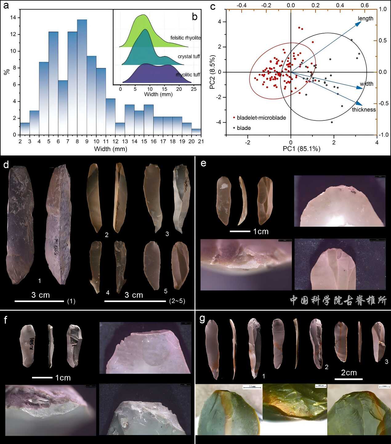 图2 西山头遗址出土的石叶类技术遗存(a~f)及软石锤直接锤击实验样品(g)