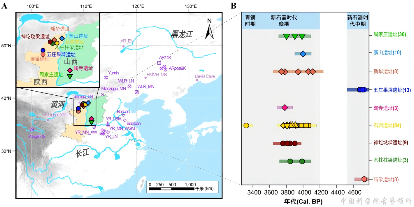 在中原方向,与石峁遗址相近时期的陶寺文化人群(以陶寺遗址、周家庄遗址为代表),在遗传上都与石峁文化人群共享有相近祖源,与陕北地区仰韶晚期人群有极强遗传联系,表明石峁文化人群和陶寺文化人群具同源性。