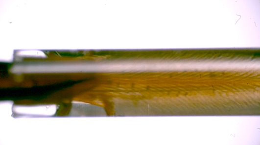 研究人员通过配置不同含糖量的蔗糖溶液以模拟花蜜,并将其注入直径为1 mm的玻璃毛细管中,模拟自然的花冠场景,供熊蜂进行采集。通过显微高速摄影技术,定量得到中唇舌每一次往复运动的摄入的花蜜体积。