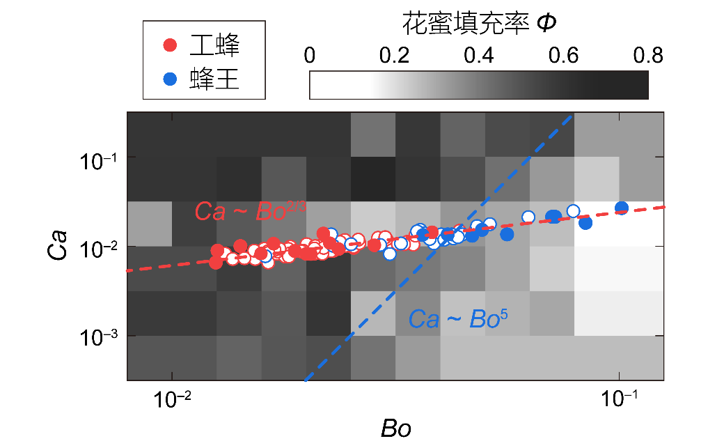 除了液体的表面张力,液体的粘度也对花蜜的捕获起到了作用。通过引入两个无量纲数:邦德数Bo = ρgLC2/γ和毛细数Ca = μU /γ = 2μLTf/γ,可以衡量这一液体输运过程中重力、毛细力、粘性力的相互作用。为了使花蜜尽可能多的填充满中唇舌的可用空间,系统应该工作在低Bo数,高Ca数的区域,这对两个无量纲数之间的关系提出了限制。为了维持较高的花蜜填充率,Ca数和Bo数应该满足Ca ~ Bo5的标度关系。然而由于中唇舌结构的生长限制,自然环境下只能维持Ca ~ Bo2/3的标度关系,因此当Bo数增大时,也就是熊蜂体型增大时,重力将起主导作用,降低花蜜的填充率。