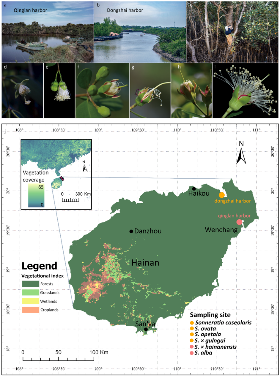 图1. 研究地区与海桑属6种花粉材料来源