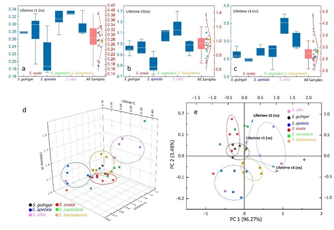 根据海南文昌与海口采集的6种海桑花粉的荧光寿命成像分析(图2),结果显示:不同物种可在荧光寿命空间中划分为4个主要类群,其中长寿命组分τ₃是最关键的区分参数;两个杂交种在花粉荧光寿命成像空间中呈现“中间状态”,与其亲本关系相对应(图3)。