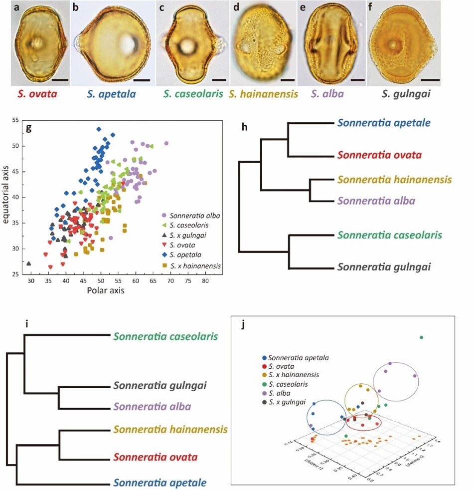 图4. 海桑属六种植物的花粉形态、分子生物学的系统分类及花粉荧光寿命成像的分类对比