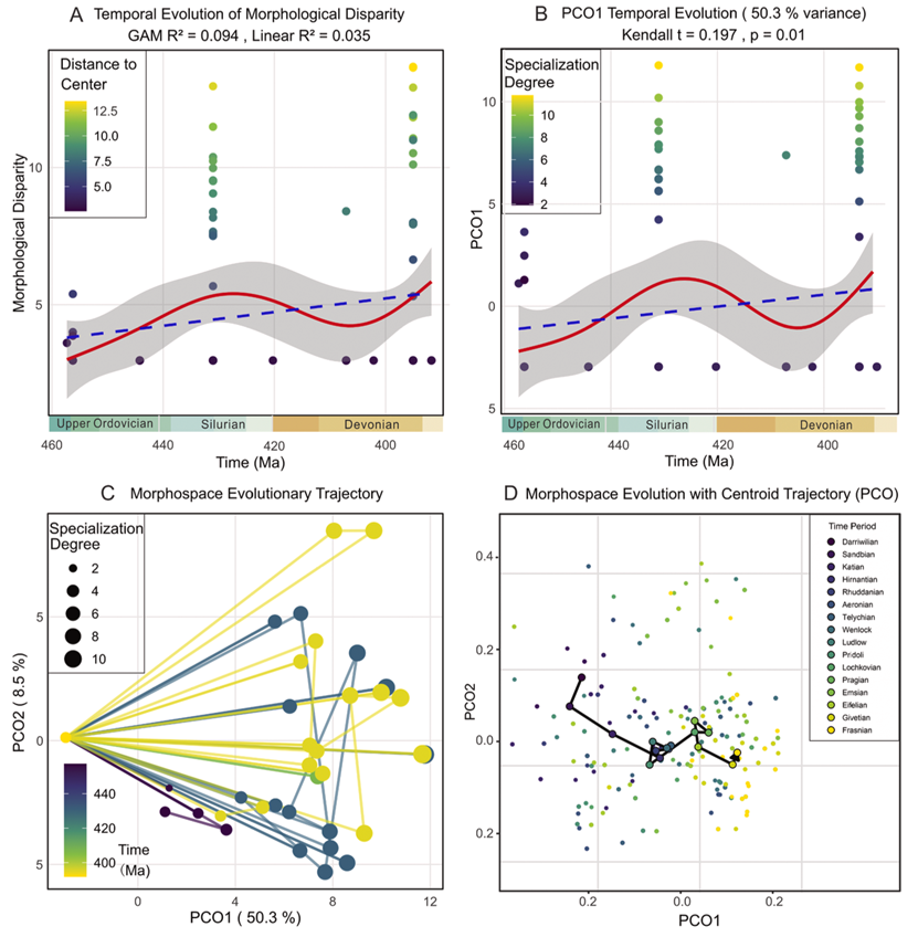 为了破解这一横跨一亿年的演化谜题,研究团队不局限于传统的多样性研究,而是建立了一套多维度的交叉分析框架。基于超1700条经过严苛清洗的高精度空间分布记录,团队提取了159个核心属的47个离散形态特征构建了形态空间矩阵。运用广义加性模型(GAMs)、PELT变点检测,以及时间序列形态差异度分析(DTT)等前沿定量古生物学方法,研究人员高精度重构了无洞贝长达一亿年的形态空间演化与多样性动态轨迹(图1,图2)。