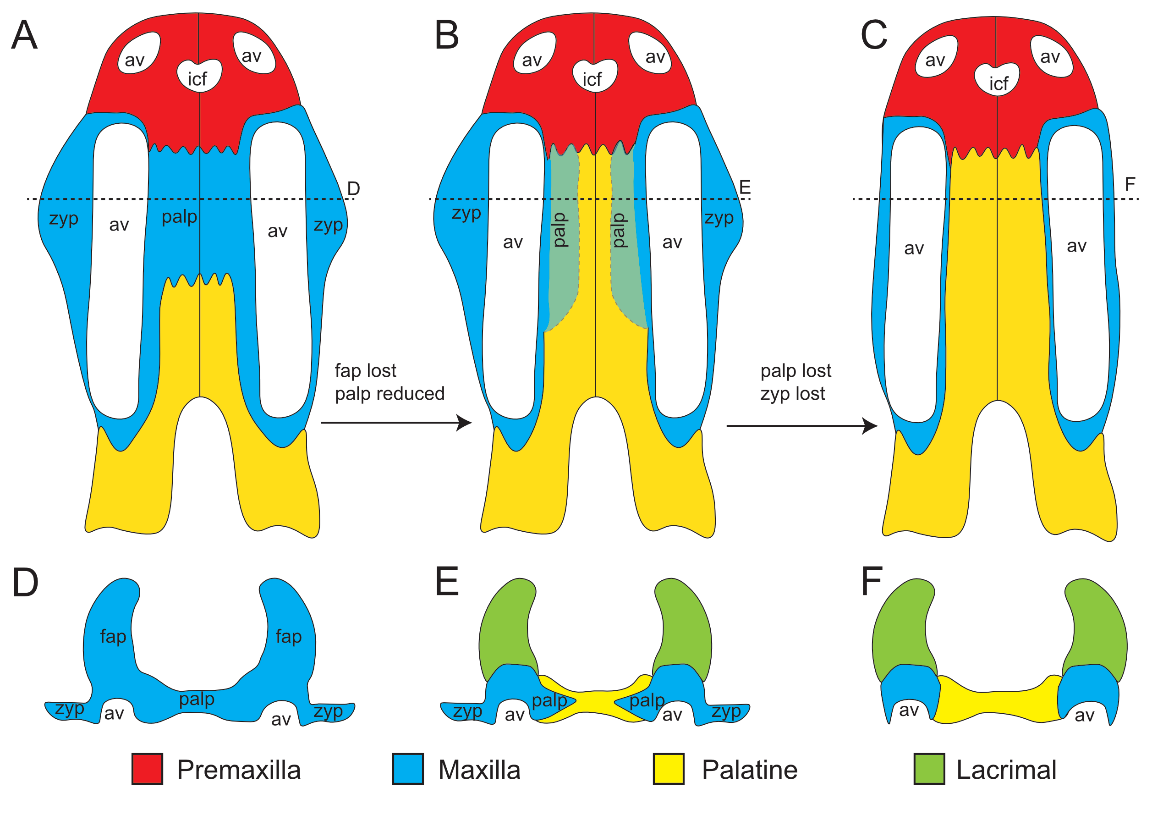 近期,《古脊椎动物学报》在线发表了新疆五彩湾地区上侏罗统小袁氏兽再研究文章,文章对其保存的骨骼形态、牙齿磨蚀方式和神经通路进行了更详细的描述和重建,讨论了上颊齿齿尖的同源性,并根据其独特的上颌骨特征。近期,《古脊椎动物学报》在线发表了新疆五彩湾地区上侏罗统小袁氏兽(Yuanotherium minor)再研究文章,文章对其保存的骨骼形态、牙齿磨蚀方式和神经通路进行了更详细的描述和重建,讨论了上颊齿齿尖的同源性,并根据其独特的上颌骨特征,提出了关于三列齿兽类上颌-腭部结构演化假说,给出了过渡阶段的形态证据。该标本最初由胡耀明等(2009)首次报道,属名是为了纪念著名地质学家、古生物学家袁复礼先生。图1-小袁氏兽标本三维重建图通过CT扫描和三维重建发现,标本实际保存有左上颌骨,腭骨、泪骨以及三颗颊齿(图1)。上颌骨部分退化(缺失面部突但保留颧突与腭突),颧突为宽而背腹扁平的骨板,腭突嵌入腭骨内部,且不暴露于次生腭腹面;泪骨极大(面部突高逾齿冠两倍);眶下孔较小、呈纺锤形且完全由泪骨包围;容纳上颌神经的腔体高大,夹于上颌骨与泪骨之间;上颊齿齿尖型式为2-4-3,具六个齿根,前颊侧齿根末端强烈内弯等详细特征(图2)。尽管只保存了三颗不完整的颊齿,但小袁氏兽的颊齿齿尖型式存在较为显著的差异,即在同一个体内,不同牙齿的齿尖形态数量不同。其中PC1的齿尖型式为2-3-3,PC2-3的齿尖型式为2-4-3。在其颊齿的舌侧列齿尖前端发育有数量不等的齿带小尖(PC1有4个,PC2-3均有1个),经过扫描电镜观察,这些齿带小尖没有磨损痕迹,推测其不具有咀嚼功能。此前研究认为,随着演化的进行,三列齿兽类的齿尖数量存在逐渐减少的趋势,但袁氏兽作为一种较进步的三列齿兽,其齿尖数量却较多。除袁氏兽外,具有齿尖数量增加现象的三列齿兽还有发现于蒙古的Shartegodon和Nuurtherium,这三个属的齿尖形态变异度明显高于其他已知的三列齿兽类。具体表现在(1)舌侧列近中端发育齿带(形态高度变异);(2)主功能齿尖也存在形态变异。由此,研究建议性提出了三列齿兽的齿尖式建立的标准:仅将功能齿尖计入齿尖式,齿带上的形态数量变化较大、或互锁区域不具咀嚼功能小齿尖,不应纳入齿尖型式统计。图2-小袁氏兽保存的三颗上颊齿上颌骨演化是另一关键问题。研究表明基干三列齿兽类(如Kayentatherium)上颌骨较为发育,和大部分其他犬齿兽一样具有发育良好的面部突、颧突和腭突,而进步类型(如似卞氏兽Bienotheroides)上颌骨退化为简单圆柱体,失去了面部突、颧突和腭突。小袁氏兽的上颌形态可能代表两者间的过渡阶段:面部突已经完全消失,其腭突虽退化但仍存在,完全嵌于腭骨内(图3B),而颧突则仍然很发育。因此研究团队提出了三列齿兽类上颌退化的可能模式:1、面部突首先消失,腭突宽度缩减。腭骨前伸包绕上颌骨腭突,使其不暴露于腭面。2、腭突完全消失,上颌脱离次生腭构成,颧突进一步退化至消失。图3-三列齿兽类上颌演化三种模式图(A-C Kayentatherium、袁氏兽和似卞氏兽腭部腹视图;D-F 对应A-C的横截面图)国家自然博物馆刘璐博士和中国科学院古脊椎动物与古人类研究所的硕士研究生任纪澄为共同一作、毛方园研究员为通讯作者。此项研究得到国家自然科学基金(42122010,42288201)、云南省振兴人才支撑计划(202305AB350006)中国科学院青年创新促进会(Y2023017)和北京市财政特别资助联合资助。论文链接:https://www.vertpala.ac.cn/CN/10.19615/j.cnki.2096-9899.250331编辑:诸鹏飞审核:盛捷<!--!doctype-->