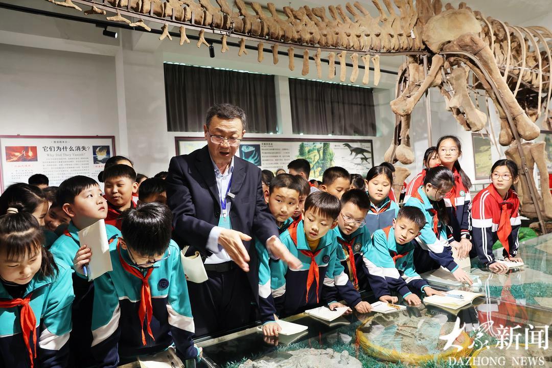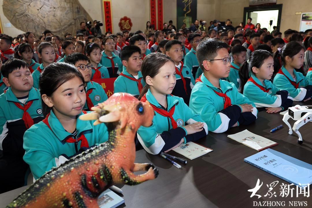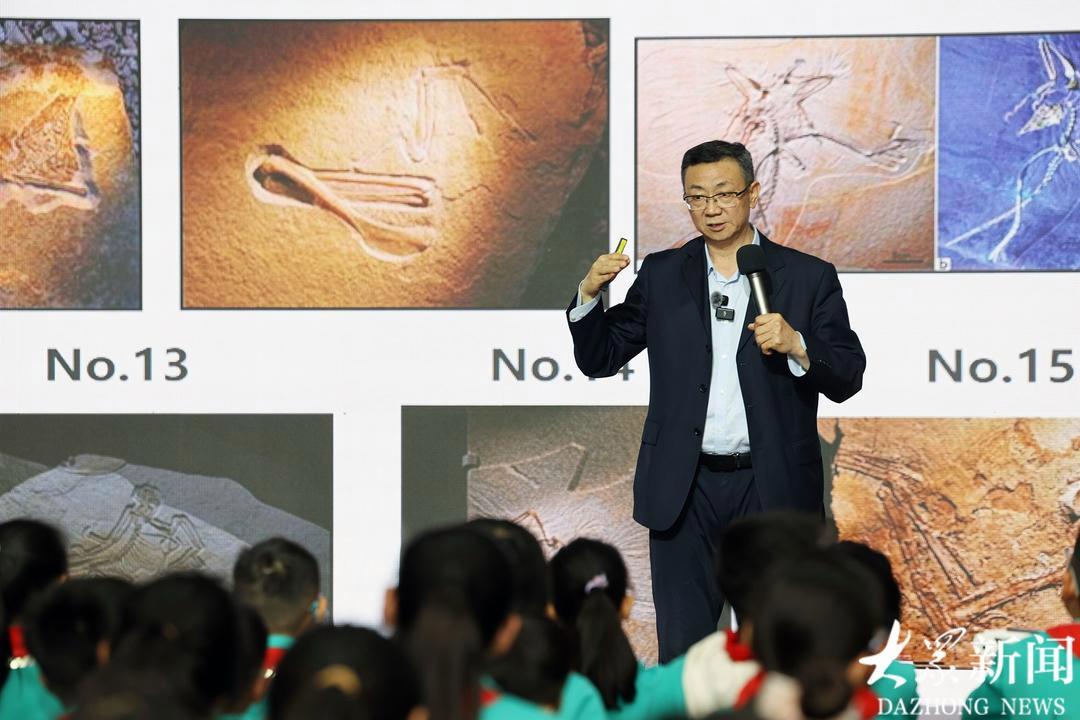 3月29日,山东天宇自然博物馆,中国科学院院士周忠和为小学生讲授有关古生物化石标本的科普知识。