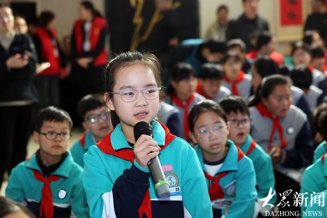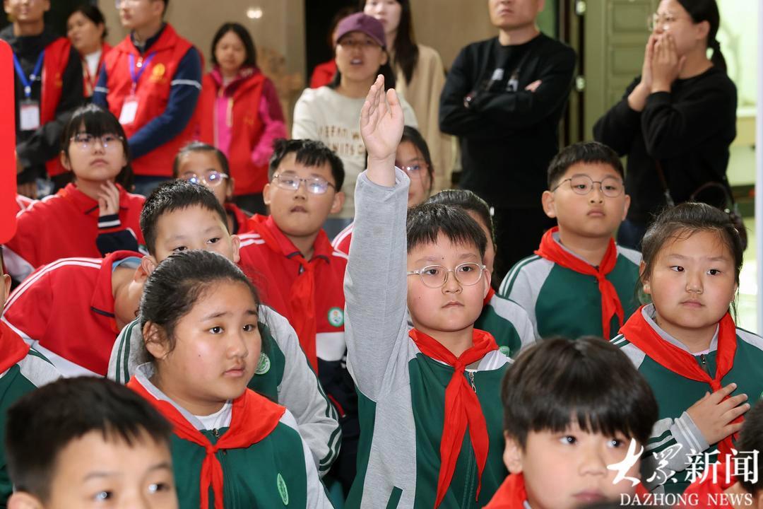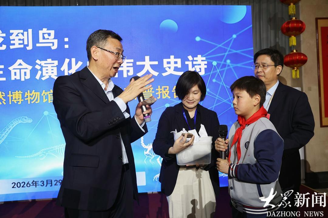 在现场互动问答环节,小学生们踊跃提问,涉及古生物习性、化石挖掘保护、AI复原古生物等话题。