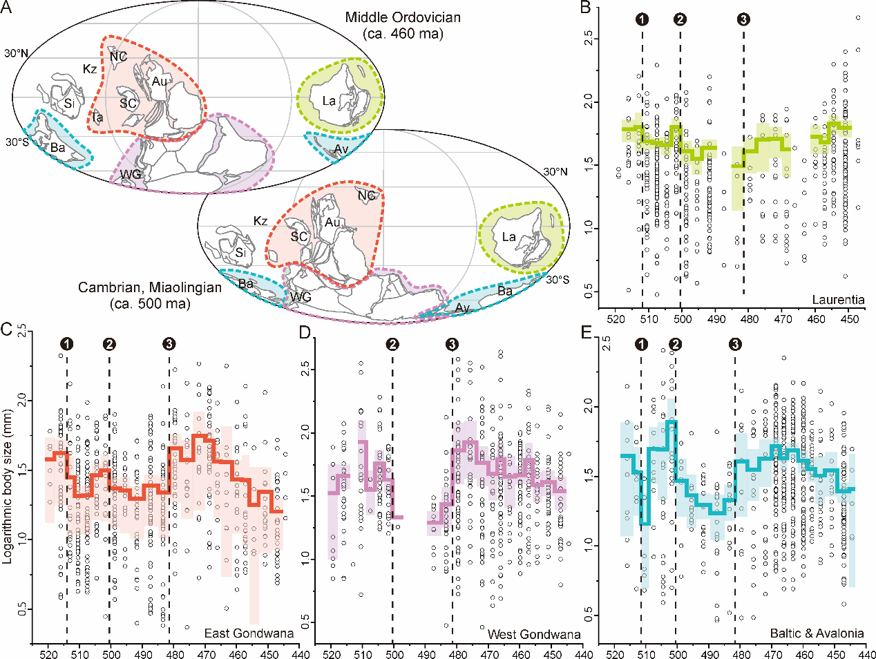 1. 古生代早期三叶虫体型的幕式演化模式。寒武纪和奥陶纪全球三叶虫的体型演化可划分为六个阶段(phase I-VI),体型在每个阶段内保持稳定,而在各阶段之间发生快速变化。其中,寒武纪第四期早期(约514 Ma)、古丈期(约500 Ma)和奥陶纪凯迪期晚期(约450 Ma)发生了明显的体型缩小事件,而在寒武纪乌溜期晚期(约506.5 Ma)和奥陶纪特马豆克期晚期(约480 Ma)则发生了两次显著的体型增大事件(图1)。统计检验证明这一模式并非化石取样造成的假象。同时,幕式演化模式在寒武纪和奥陶纪时期全球四个主要地理单元均能识别(图2),显示三叶虫体型演化模式主要受到全球而非区域性机制的控制。