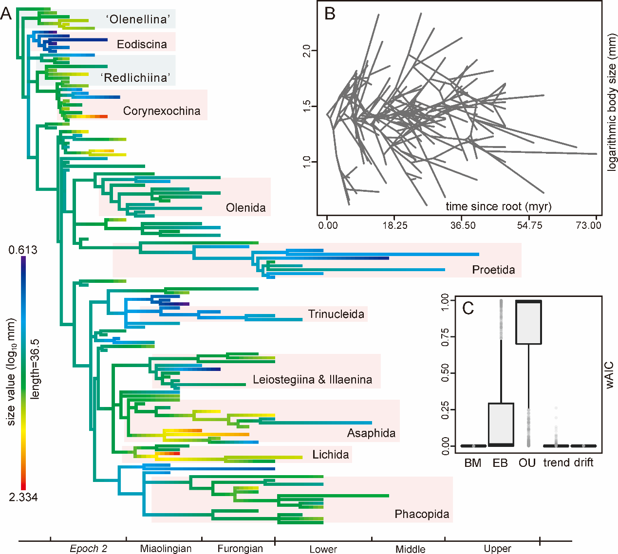 图3:基于系统发育框架古生代早期三叶虫科一级体型演化(A,B)及模型匹配结果(C)
