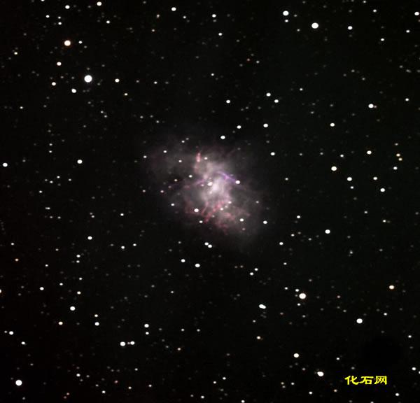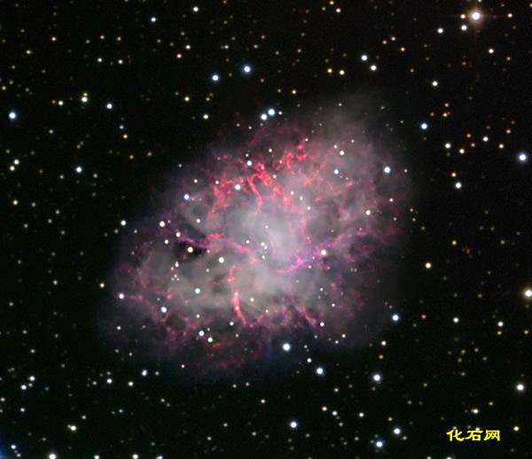 蟹状星云位于金牛座,距离我们大约6500光年,大小约为12×7光年,亮度是8.5星等,肉眼看不见。对蟹状星云最早的记录出自英国的一个天文爱好者(1731年),1771年法国天文学家梅西耶在制作著名的“星云星团(M)表”时,把第一号的位置,留给了蟹状星云,编号为M1。