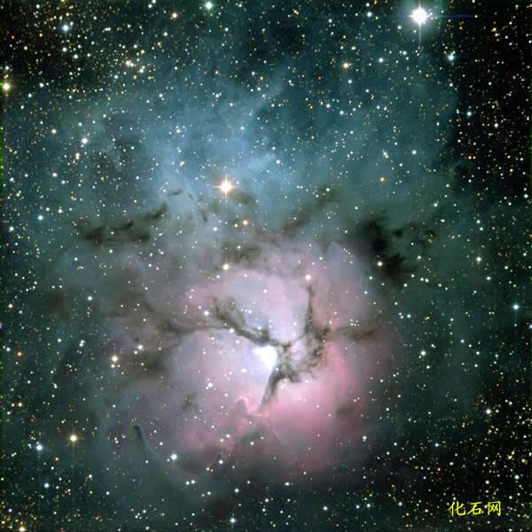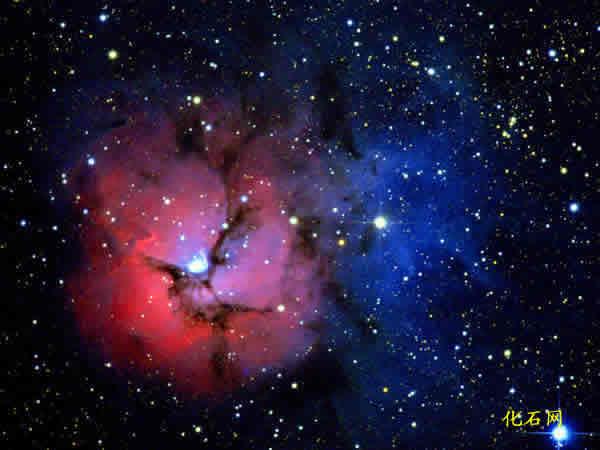 在三叶星云的中心有一个包含有炽热年轻恒星的疏散星团。这些恒星发出强烈的辐射轰击周围星云中的氢原子,使它们失去了电子,当电子与质子再次组合时,它便发射出奇特的光——其中之一就是在星云中所能见到的红色。