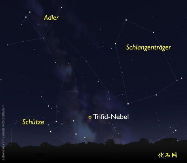 三叶星云位于人马座。人马座在银河系中心方向位置,每年夏天是观测人马座的最好时机,在6月和7月每当太阳下山时,人马座便从东方升起,基本整夜可见。三叶星云目视星等约为9等,肉眼不可见,用一个小型天文望远镜即可见,在大型天文望远镜里,则会看到三叶星云的很多细节,非常漂亮。三叶星云距离我们5600光年,因貌似由三片叶子组成的鲜花而得名,是最漂亮的星云之一,深受天文学家和天文爱好者们的喜爱。