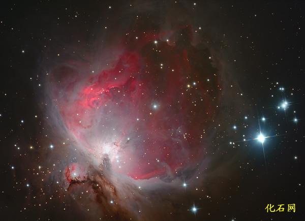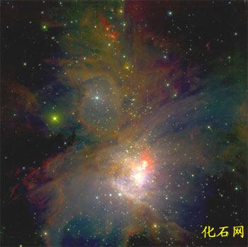 猎户座大星云,直径约16光年,视星等4等,距地球约1300光年。猎户座大星云正不断孕育出大量新的恒星,其中大部分恒星都形成于200-300万年前,也就是说,它们的实际年龄还不到太阳和地球的千分之一。该星云中的许多恒星目前正处于形成阶段,因此它们的周围还包裹着一层非常厚密的尘埃云团。与可见光不同的是,红外线能够穿透宇宙中的尘埃物质,这样天文学家们便可借助红外观测设备来了解恒星的形成过程。