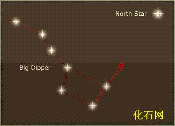 天枢和天璇两星相距约5°,如果把这两颗星用线段连接起来,沿天璇至天枢方向延长约五倍,就可找到一颗恒星,这就是著名的北极星,即小熊座α。北极星是目前来说距北天极最为接近的一颗亮星。在北斗七星中的北斗六12′处有一颗稍暗的四等星(晴朗无月夜,眼力较好的就能看到),这颗星叫“辅”,即大熊80。