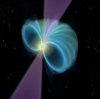 脉冲星是具有短周期脉冲辐射的新型恒星。脉冲星主要有如下观测特点:周期性地发射短促的脉冲辐射;脉冲周期很短,周期最短的只有0.03秒,最长的为4.3秒;脉冲辐射多呈单峰或双峰形状,有的甚至多到五个峰;脉冲辐射持续时间约为周期的百分之一到十分之几;脉冲辐射是高度的线偏振或椭圆偏振;绝大多数脉冲星只是在射电波段发出辐射;有些脉冲星的个别脉冲会出现规则的向前或向后的漂移现象,有些脉冲星有时会呈现短缺脉冲现象;个别脉冲星有周期突然变化的现象。
