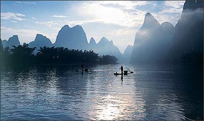漓江为西江支流桂江上游干流,发源于桂东北兴安和资源两县交界的广西第一峰――猫儿山,南流至兴安县榕江镇汇灵河,始称漓江,至平乐县后称桂江。漓江平均含沙量0.067公斤/立方米,水清见底,游鱼可数,是国务院公布的第一批国家重点风景名胜区之一。漓江以风光旖旎著名于世,自桂林至阳朔的80公里漓江河段,澄碧的江水,萦绕于玉笋瑶簪般的群山之间,千峰倒映,岸竹依依,似一幅锦绣画卷。若遇烟雨笼江,山色空蒙,舟行雾海,又是一番"烟波迷万壑,雾海隐千峰"的迷人景象。世所称誉的桂林山水,主要集中在这段漓江上。
