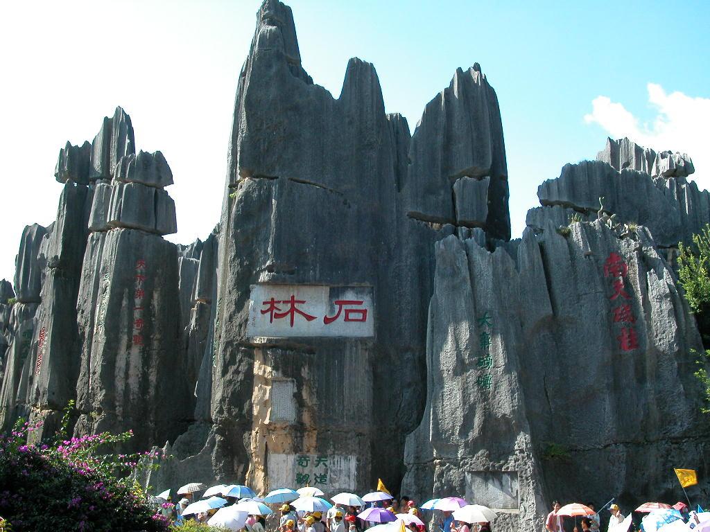 石林位于昆明市东,是世界罕见的风景名胜,是大自然鬼斧神工的杰作。在路南广达400平方公里的区域内,遍布着上百个黑色大森林一般的巨石群。有的独立成景,有的纵横交错,连成一片,占地数十亩,上百亩不等。最典型的一片叫李子菁石林,只见奇石拨地而起,参差峥嵘,千姿百态,巧夺天工,被人们誉为“天下第一奇观”。