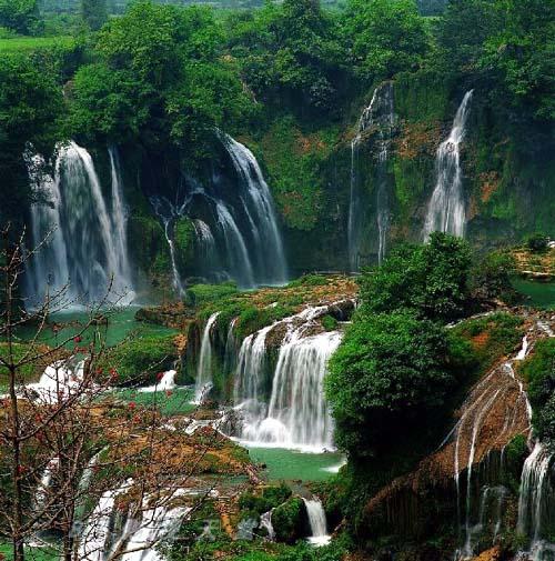 德天跨国大瀑布源起广西靖西县归春河,终年有水,流入越南又流回广西,经大新县德天村处遇断崖跌落而成瀑布。