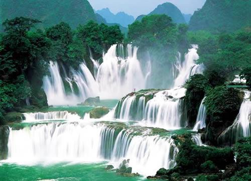 德天跨国大瀑布源起广西靖西县归春河,终年有水,流入越南又流回广西,经大新县德天村处遇断崖跌落而成瀑布。