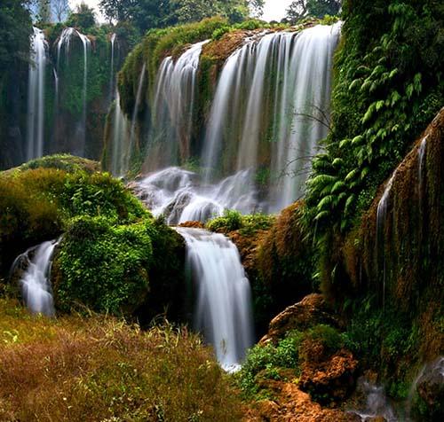 瀑布上游,河水时急时缓,时分时合,迂回曲折,于参天古木间,花草掩映,百鸟低徊,江水忽遇断崖,飞泻而下。恰似一巨大银练,高悬挂于峡谷之上。站在瀑布之下,水气蒸腾,上接云汉,其滚滚洪流,折而复聚,飞泻而下,连冲三关。