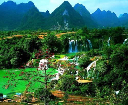 瀑布随四季变化,姿色各异:春,木棉如火,点缀在一片银河倾盆之间,顿觉春风得意;夏,河水涨溢,激流排山倒海冲泻而下,倍感两袖清风,心旷神怡;秋,素娟高挂,碧水清流渲染在丰收景致之中,注满了丰收的喜悦;冬,流水织秀,多束水流悠然而下,感受神清气和,心境清高.天旅游景区,名胜之多,风景之美,又岂止是德天瀑布?整个景区,真是处处皆景。