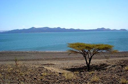 肯雅北部地方是一片望不到尽头的沙漠,这里由于干旱荒凉,人烟稀少,几乎不生长任何农作物,只是稀疏地分布着一些荆棘和灌木丛,当地居民以游牧或者半游牧业为主。然而,当你乘飞机飞越这片土地时,凭窗俯视,眼下仿佛有一颗巨大而又美丽水晶珠在茫茫荒野上跳跃着,这就是非洲著名的内陆湖泊——图尔卡纳湖,又名碧玉湖。图尔卡纳湖曾经被称为“卢多尔湖”,卢多尔夫是奥地利太子的名字,1975年改用湖区西岸马赛族的图尔卡纳部落的名字。