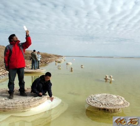 几名游客在察尔汗盐湖观赏盐花。