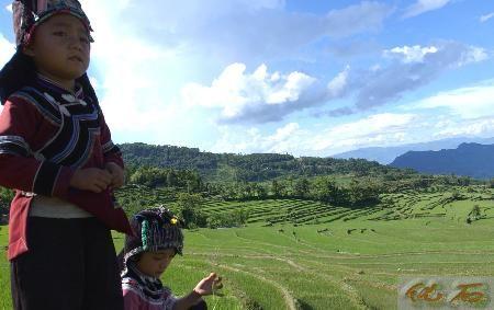 两个哈尼族小女孩在云南省元阳县箐口村哈尼梯田边玩耍