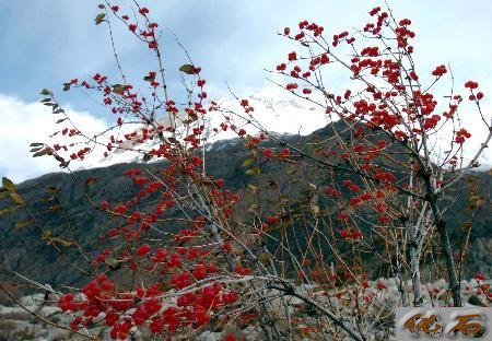 西藏自治区八宿县岗日嘎布湖和雅隆冰川附近的植物在冰雪中绽放