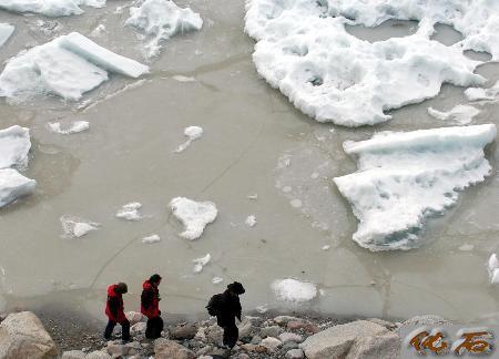 几位游人在八宿县内的岗日嘎布湖旁游览,湖面上漂浮着雅隆冰川断裂的冰块
