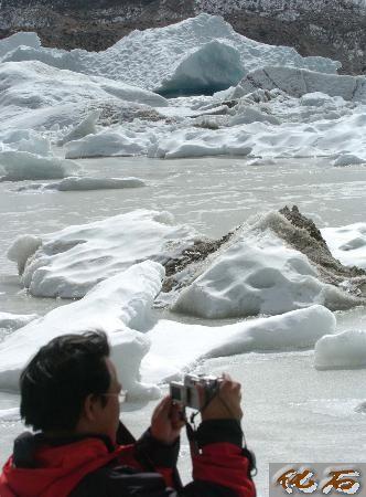 一位游客在西藏八宿县岗日嘎布湖旁拍摄湖面上漂浮着的冰块