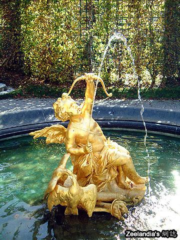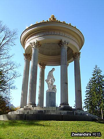 当我走上皇宫后头海神喷泉上方的北坡凉亭俯看整体景观设计(包括皇宫,小花园及喷泉等),乍然发现所有一切排列成一个大十字:从北坡凉亭,顺着阶梯状的流泉往下走,聚集在海神喷泉(Neptune Fountain)后,连接皇宫,花神喷水池(Water Parterre: Flora and Putti)则夹在皇宫与露台花园(Terrace Garens)之间,最后与南坡上的维那斯神殿(Temple of Venus)串成十字的直线;而皇宫左右(西东)两侧的喷泉花园(Fama与Amor)则与皇宫形成十字上的横线。试着把呈十字状的大教堂蓝图套在林德霍夫宫的景观:皇宫就像大教堂庄严又华丽的正门,皇宫前的花神喷水池是中堂,而百花齐放的露台花园就是引吭高歌的唱诗班,尽头的维那斯神殿就是祭坛所在。 自满于对林德霍夫宫景观的诠释,沿着想象路径,我的朝圣之路也在维那斯神殿前画下句点。