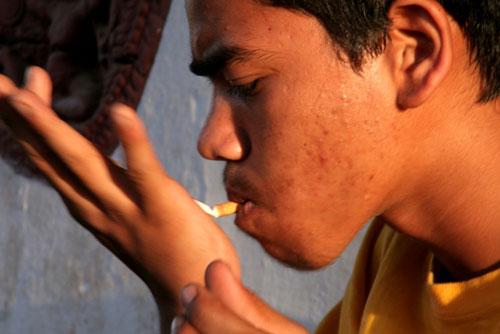 一个男孩先把普通香烟的烟丝磕掉。再卷入大麻烟叶。点燃后,几个人轮换,一人吸一口。我问,能试一下吗?其中一个说,可以,把卷好的烟递过来。