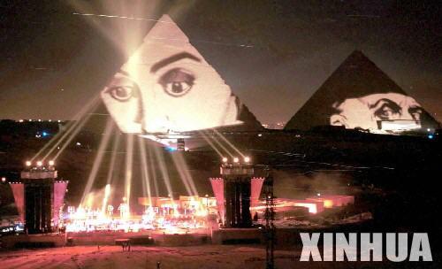 这是1999年12月29日夜,埃及迎新千年庆典在金字塔下进行最后彩排。埃及历史悠久、文化灿烂,名胜古迹众多,旅游收入是埃外汇收入主要来源之一。主要旅游点有:金字塔、狮身人面像、爱资哈尔清真寺、古城堡、希腊罗马博物馆、卡特巴城堡、蒙塔扎宫、卢克索神庙、卡纳克神庙、国王谷、阿斯旺水坝等。