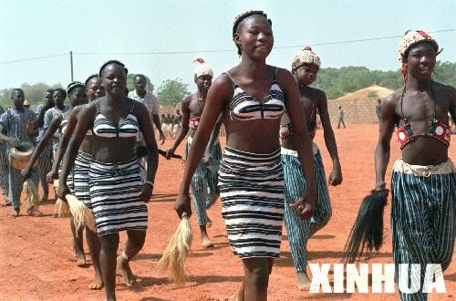 这是布基纳法索青年男女列队进入表演场地,表演民族舞。