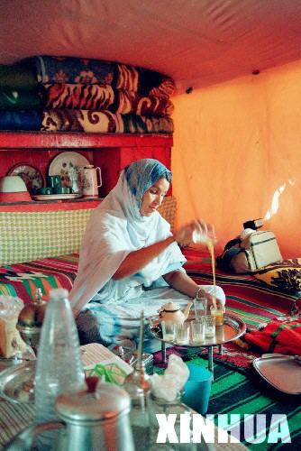这是一名西撒哈拉家庭主妇在煮茶。到西撒人家中做客,主人必用西撒茶招待。这种茶煮法独特,喝法讲究:第一杯茶味道极苦,象征生命;第二杯略甜,象征爱情;第三杯最甜,象征死亡,其寓意富有浓郁的伊斯兰色彩。